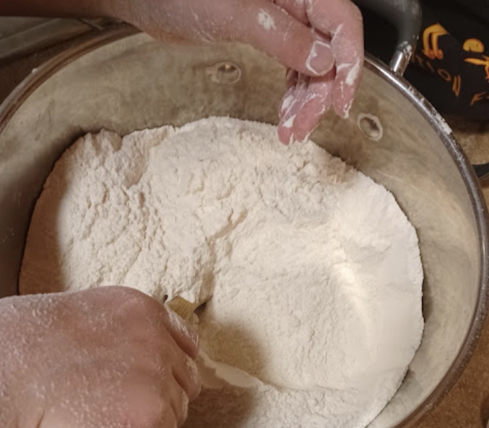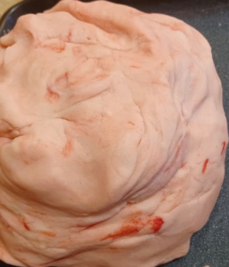 Add in a few drops of kid-safe scent (not very much) and quite a few drops of food coloring (if you use food coloring instead of water-color paint, you can compost playdoh at the end of its use):