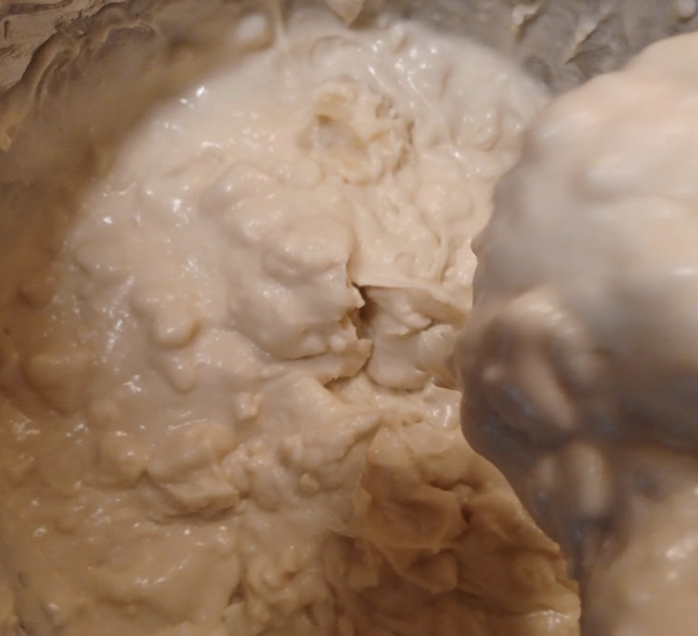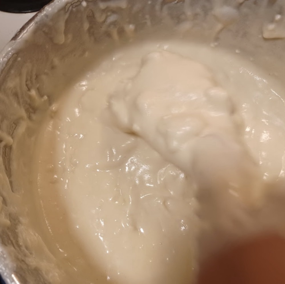 When it’s done, it should look pretty well integrated but you should be questioning if it’s actually done. Remember it will continue to cook after it’s removed from heat. It won’t look like playdoh yet and should still be quite lumpy and sticky. It shouldn’t be shiny any more: