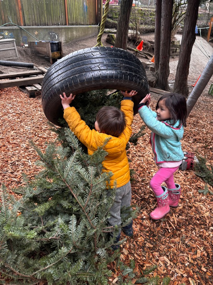 Well today presented quite the challenge. The tire swing, a favourite for many of our class, was tangled up with a conifer, courtesy of our kindergarten friends no doubt—and a puzzle for our preschoolers to solve.
