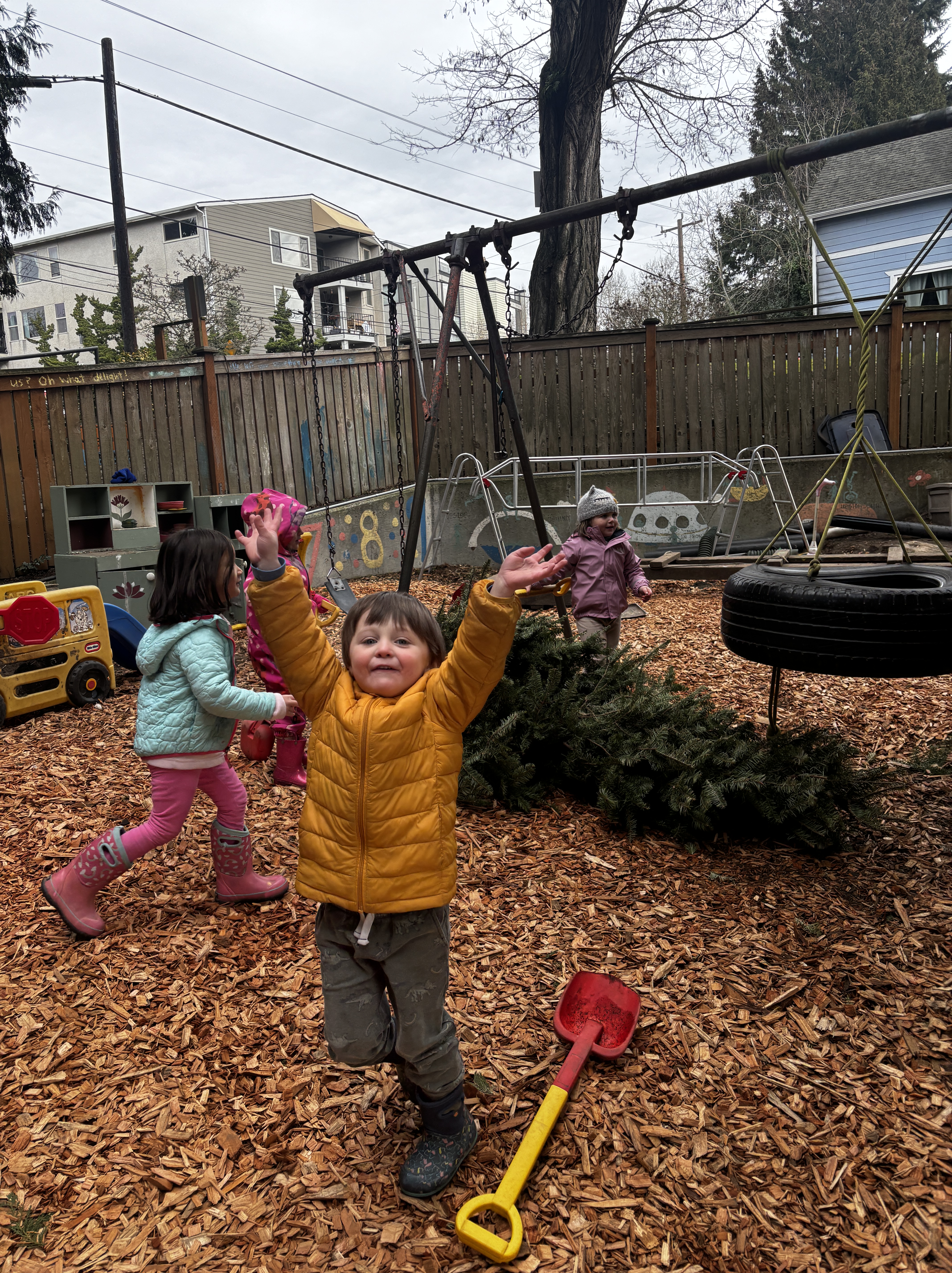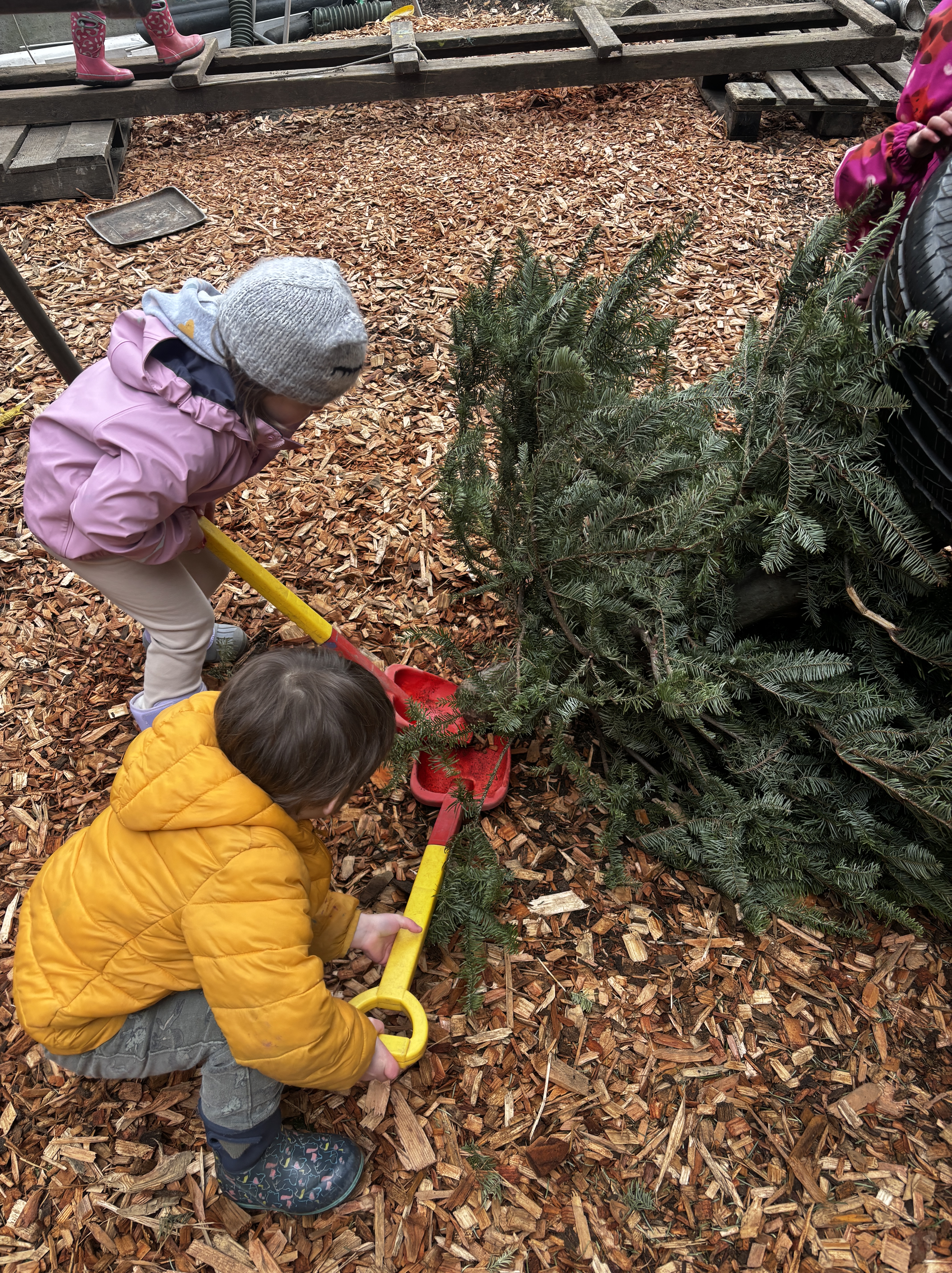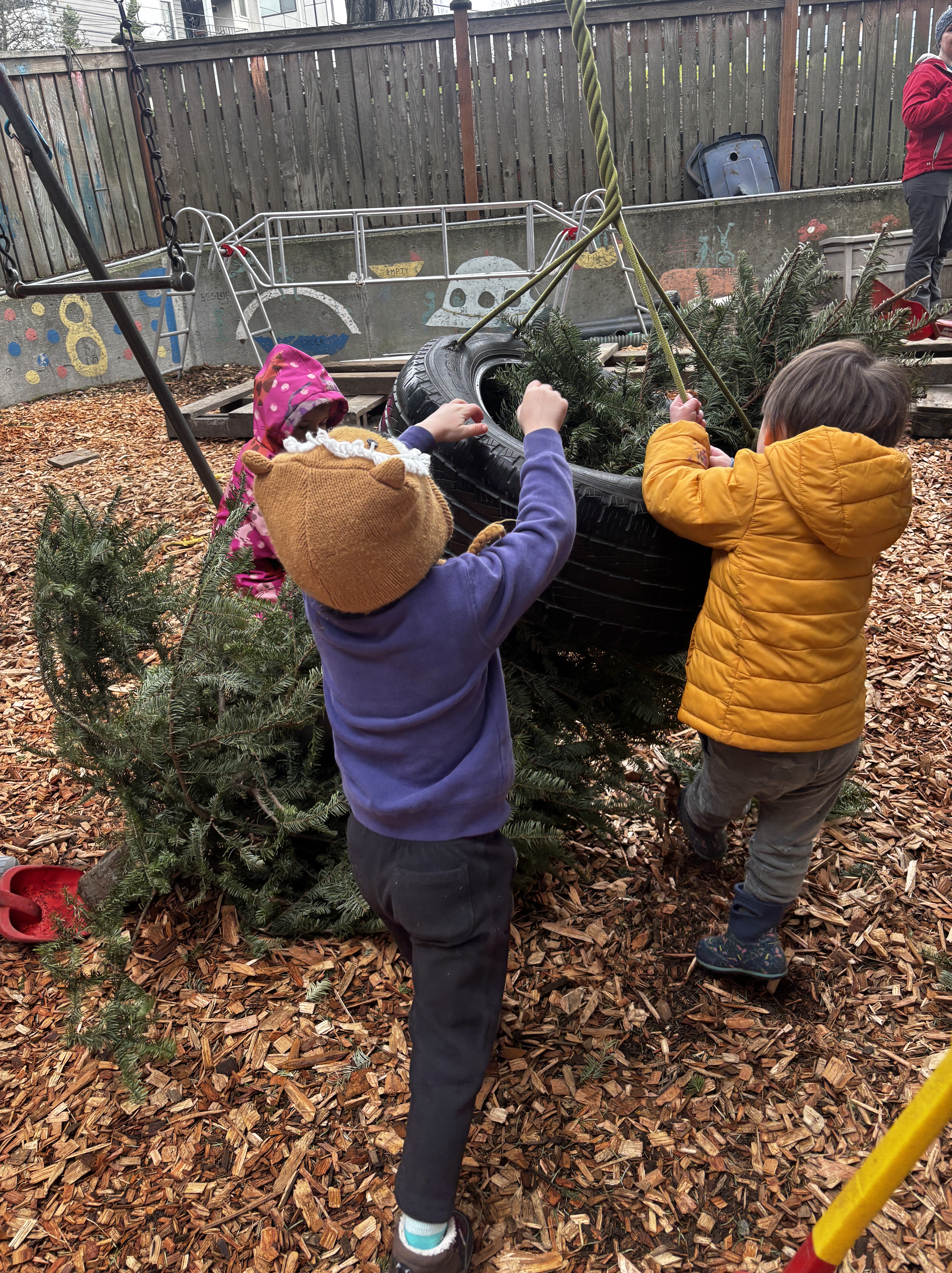 Well today presented quite the challenge. The tire swing, a favourite for many of our class, was tangled up with a conifer, courtesy of our kindergarten friends no doubt—and a puzzle for our preschoolers to solve.