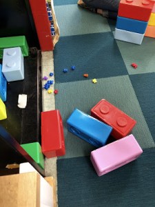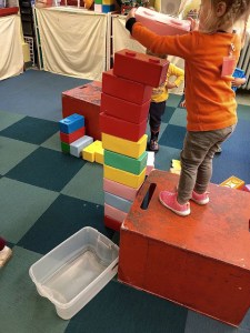 Of course, that doesn’t mean she won’t continue to try to stack blocks to the ceiling or the sky or to outer space. On the contrary, for many of us, that’s exactly the point, to challenge ourselves, to see how far we can go before it all comes crashing down. We learn quite young to not cry when our buildings fall, unless it comes at the hands of others like the boys who are still tempted (which is why I was working to “teach” the lesson of “not knocking down”). In fact, for most of them, most of the time, the response is to laugh, often giddily, sometimes even wildly. Many, once they’ve recognized the inevitable bending back toward the earth are even eager to help it along, giving it an extra push.