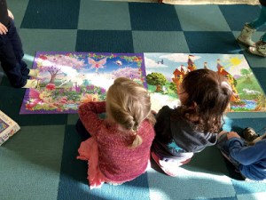 I was working a floor puzzle with one of the kids. It’s a popular puzzle, one with fairies, unicorns, and a castle, but everyone else was busy elsewhere so we were one-on-one. Soon, however, we were joined by another girl, and together, the three of us fit the final piece into place. Then we began admiring our handiwork, as one does.