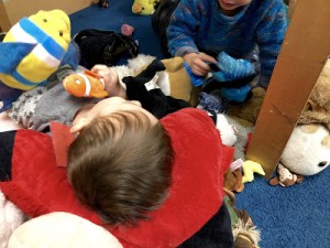 Last week, I found a pair of our three-year-olds holed up under our loft, surrounded by stuffed animals, cracking one another up with rhymes.